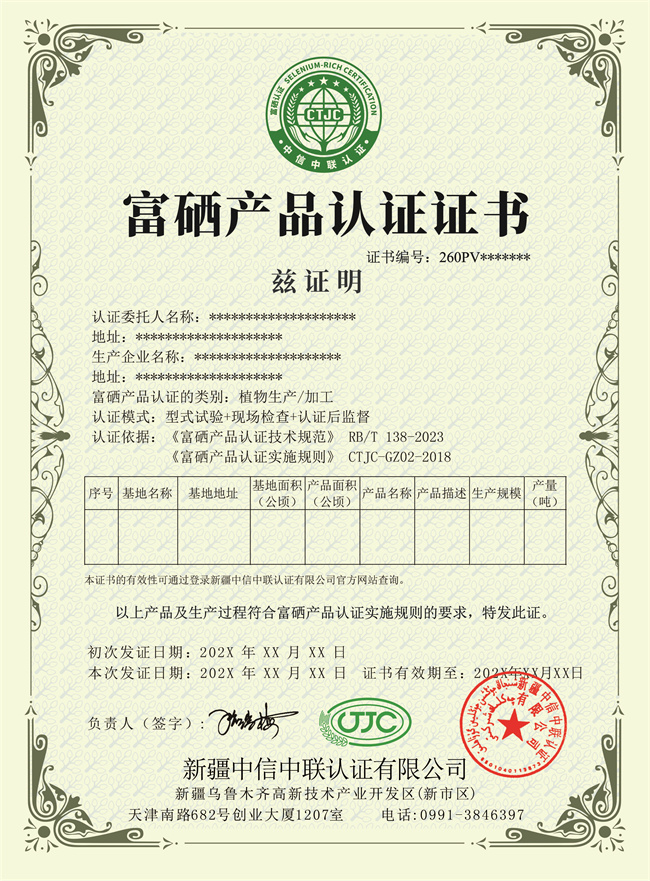 中信中聯(lián)-富硒產(chǎn)品認(rèn)證證書(shū)模版