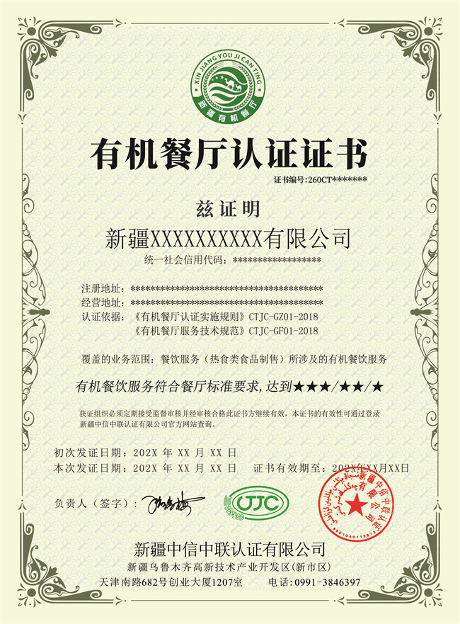 中信中聯(lián)-有機(jī)餐廳認(rèn)證證書模版