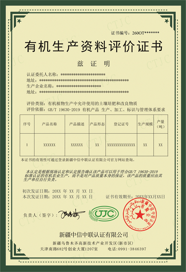 中信中聯(lián)-有機生產(chǎn)資料評價證書模版